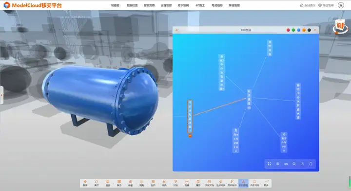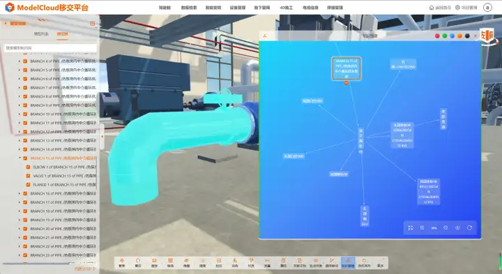 传统工厂资产管理往往面临信息分散、检索困难、关联性弱等挑战。ModelCloud的知识图谱功能通过可视化图形网络,将设备、生产线、厂房结构等实体资产与其基础数据、技术文档、维护记录、三维模型等文件有机连接。只需轻点节点,用户即可穿透查看资产全貌,从规格参数到历史运维记录,所有信息一目了然+。