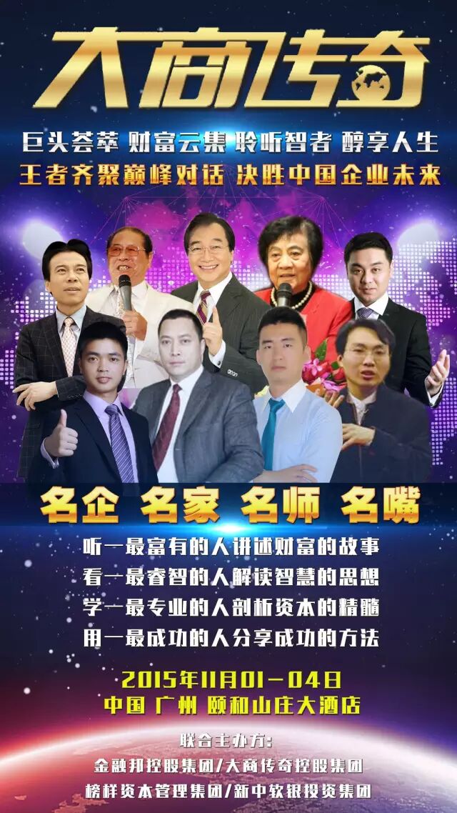 第九届<大商传奇>暨金融邦周年年庆将于2015年11月1~4日在中国广州隆重举行!本次峰会将实现资源、资本、人脉全面整合,进行产业联盟!